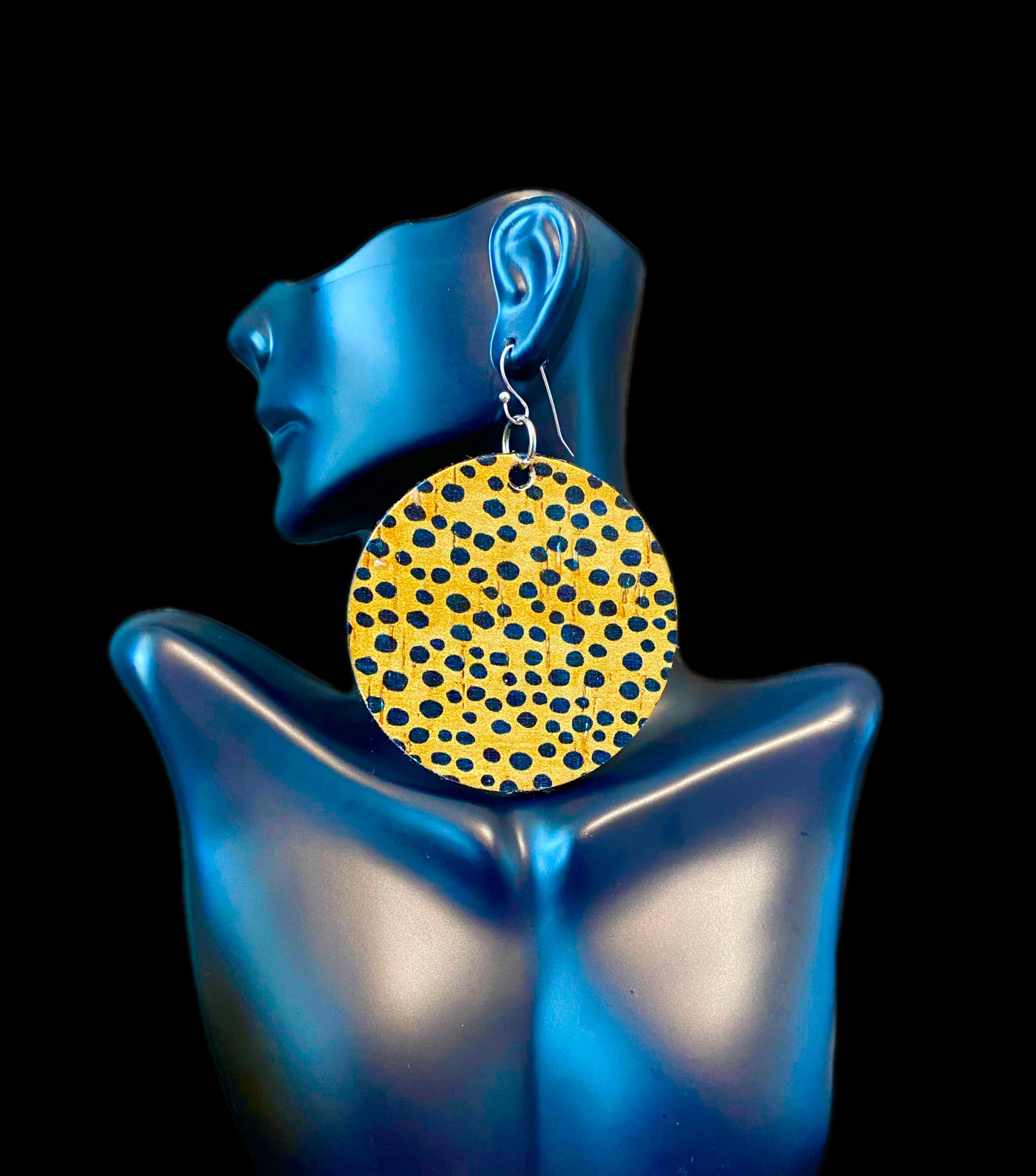 Double sided, genuine leather backed cork earrings. 2.8”.